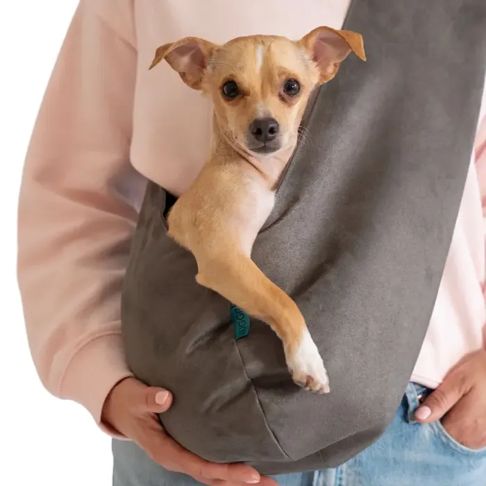 Our signature SNUGGIT is made from buttery soft, vegan ultra suede fabric. You'll find this medium-weight fabric is durable and holds the weight of your pup perfectly. Each SNUGGIT has an attached harness hook inside for your pet's safety.