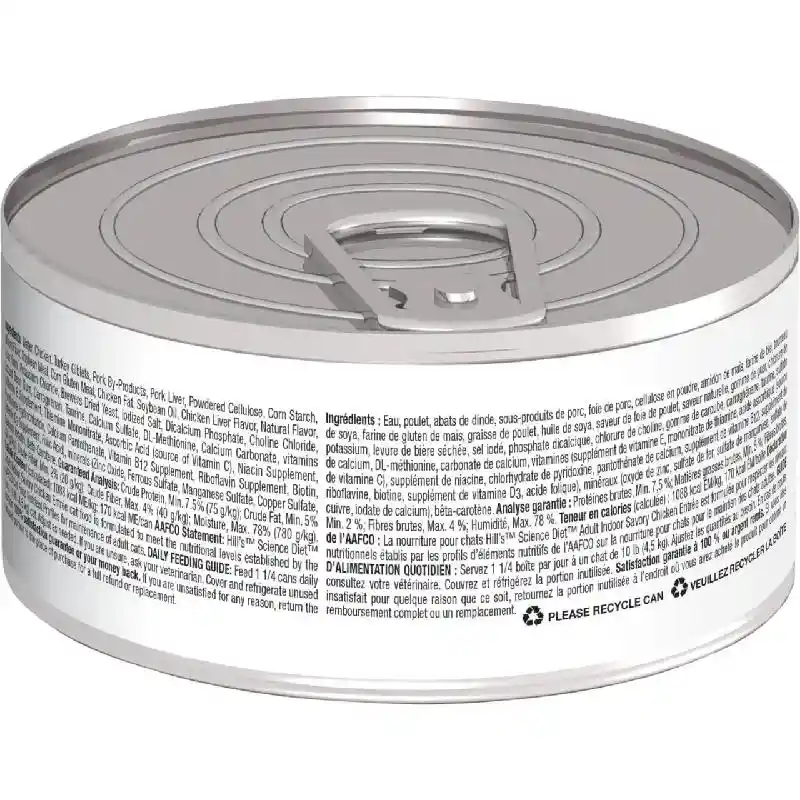 Hill's Science Diet Adult Indoor Savory Chicken Entree Canned Cat Food provides your four-legged friend with great tasting nutrition for a long, happy life. Made with wholesome ingredients such as savory chicken, this nourishing recipe is balanced to meet your indoor pet's needs, help maintain a healthy weight and avoid hairballs. Manufactured in the United States, every ingredient meets strict requirements for purity and nutrient content which exceed industry standards. Formulated for adult cats from 1 to 6 years old, this Hill's Science Diet provides your cat the nutrition she needs for a lifetime of health and happiness.