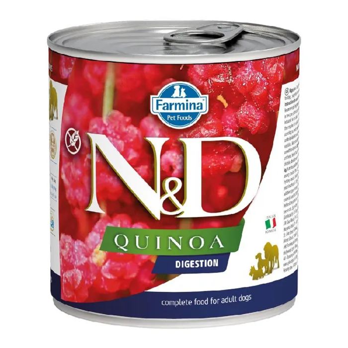 FUNCTIONAL WET FOOD. N&D rawcan™ Quinoa Digestion Lamb Canine is an all-natural complete wet food formulated to meet the nutritional levels for maintenance. A special functional L.I.D. wet formula recommended especially for dogs with digestive issues and exocrine pancreatic insufficiency. Our rawcan™ technology is a proprietary 1-step gentle steam cooking process to ensure the bioavailability of the nutrients of each ingredient in every diet. Made with GMO-Free and human-grade fresh (never frozen) ingredients like boneless free-range grass-fed lamb, sustainablly sourced wild-caught herring, organic quinoa seed, artichoke and fennel. Low glycemic index, grain-free and gluten-free recipe with no legumes, potato, soy, by-products, hormones, antibiotics, or artificial preservatives. Made with natural antioxidants, prebiotics, glucosamine and chondroitin. No Guar, Xanthan, Cassia, Industrial Gums, Carrageenan, or Emulsifiers used. No water or broth added for processing. All formulations are scientifically-proven and clinically-tested thru certified cruelty-free research. Fully recyclable BPA-Free cans with FSC paper labels.