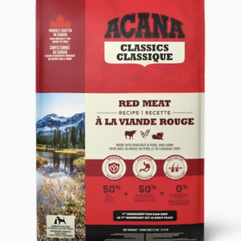 ACANA™ Classics Red Meat Recipe features a 50/50 balance of premium animal ingredients, including raw beef (16%) and lamb meal (15%), combined with wholesome grains, vegetables, and fruits for a nutritious meal. Antioxidants from fruits, vegetables, and vitamin C support immune health, prebiotics and fiber promote healthy digestion, and Omega-3 fatty acids from fish oil enhance skin and coat health. Ingredients: Beef, lamb, pork, barley, peas, oat groats, fish oil, cranberries, blueberries, and botanical supplements. Made in Canada with the world's finest ingredients.