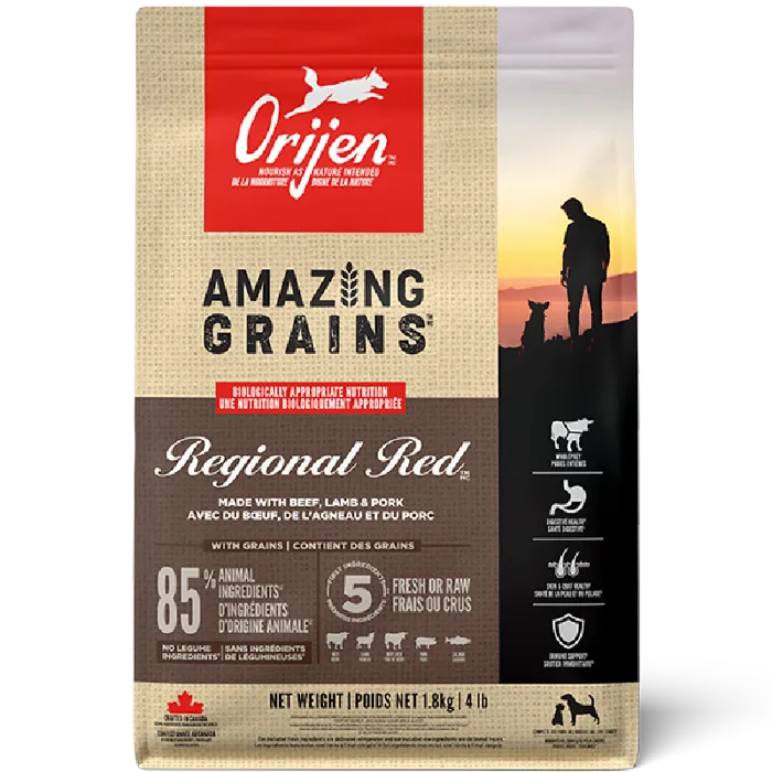 Canadian Brand. ORIJEN Amazing Grains Regional Red is packed with 90% premium animal ingredients, including beef, wild boar, goat, lamb, and wild-caught mackerel. This high-protein, WholePrey recipe supports muscle maintenance, skin and coat health, and immune function. A nourishing blend of oats, quinoa, and chia provides balanced fiber and digestive support with prebiotics and probiotics. Crafted to deliver peak nourishment, it's the ideal diet for dogs who thrive on rich, red meat variety.