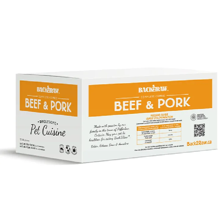 Canadian Brand. Back2Raw is family owned and made in Pefferlaw, Ontario with fresh and local ingredients. This grain free food is made with antibiotic & hormone free meat, and without additives, preservatives or fillers. The 12 pound Complete Combo Beef & Pork box contains 6x 1 pound portions of Beef Recipe as well as 6x 1 pound portions of Pork Blend. This formula also includes Back2Raw's Healthy Life Blend of organic fruits and vegetables. May your pet be healthier for eating Back2Raw.