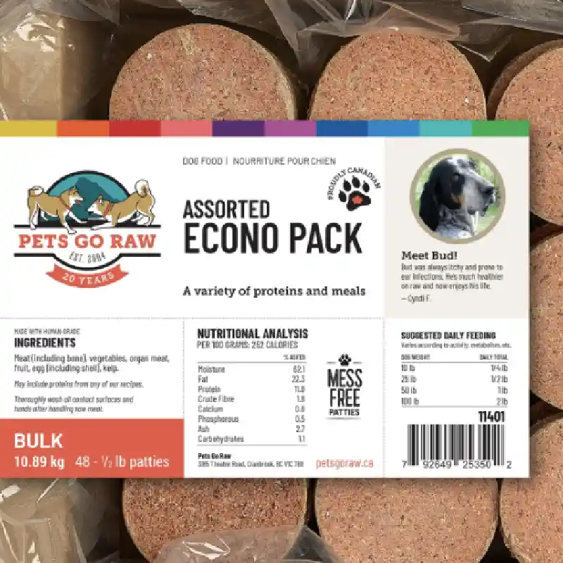 Econo Recipe Assorted Econo Pack features a balanced blend of meat (including bone), vegetables, organ meat, fruit, egg (including shell), and kelp. Ingredients provide essential nutrients with an analysis of 62.1% moisture, 22.3% fat, 11.8% protein, 1.8% crude fiber, 0.8% calcium, 0.5% phosphorus, 2.7% ash, and 1.1% carbohydrates. Contains 252 calories per 100 grams. Feeding amounts vary by dog weight and activity level.