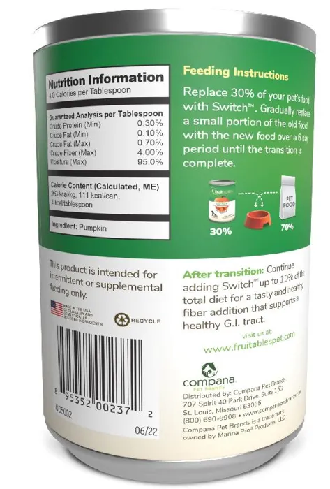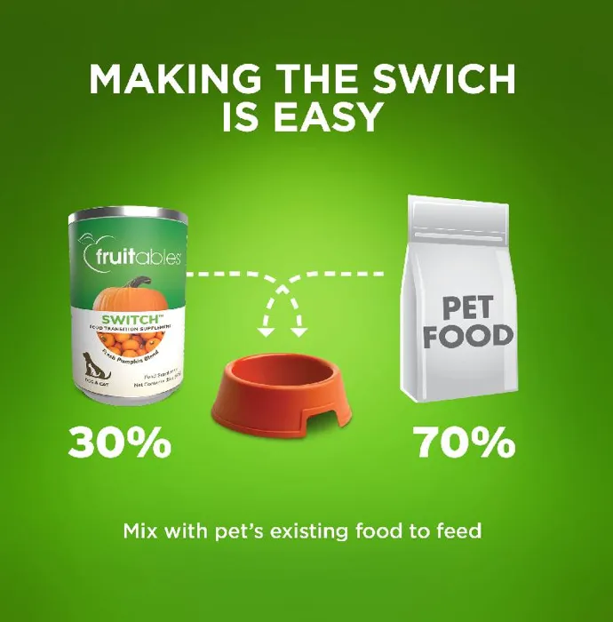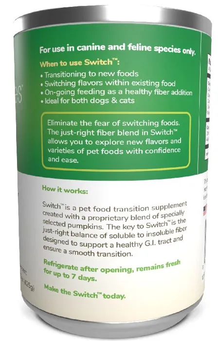 The biggest barrier to trying new pet foods is the fear of digestive upset or food refusal. This means that most pets are fed the same old food day after day. With Switch, transitioning to a new food has never been easier or with less risk. Switch uses a proprietary new blend of different pumpkin varieties to achieve a just-right balance of soluble & insoluble fiber. This blend works to buffer the impact of new proteins and fats and Switch's highly palatable pumpkin base provides a flavor that dogs love. This natural approach makes switching foods easy and worry free.