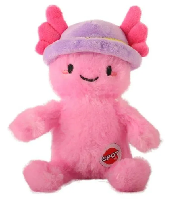 Spot's adorable axolotl dog toys made with super soft plush, embroidered face and a hat. Fully stuffed body with squeaker inside. Assorted pink and purple colors.