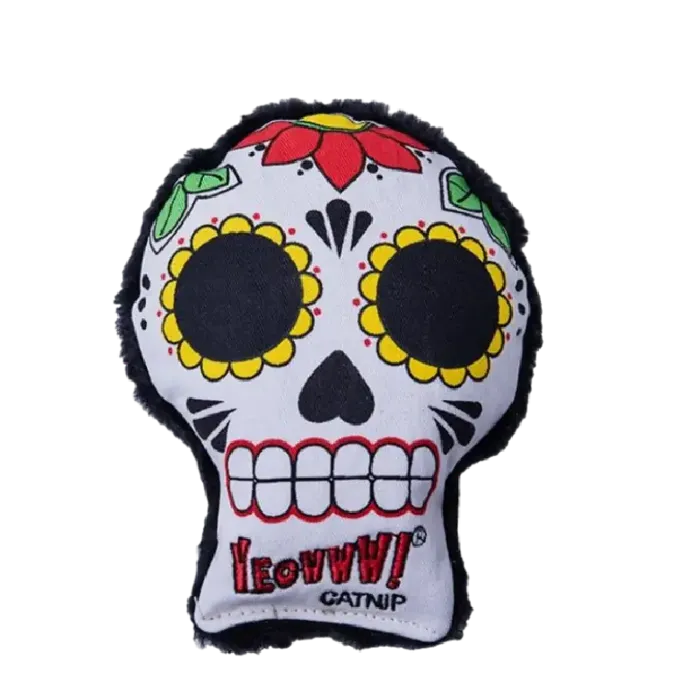 Based on the design of calaveras, the decorative skulls emblematic of Día de los Muertos, La CAT-rina is an elegant and colorful feast for kitty’s senses. The face is covered with our durable cotton twill, perfect for withstanding celebratory shenanigans involving teeth and claws. Meanwhile, the back is fuzzy and soft, providing kitty with a place to rest her head when playtime is over. At more than 5" tall and 4" wide and packed with more than 1.5 ounces of our very own organically grown catnip, La CAT-rina is big enough to satisfy the cravings of any feline friend.