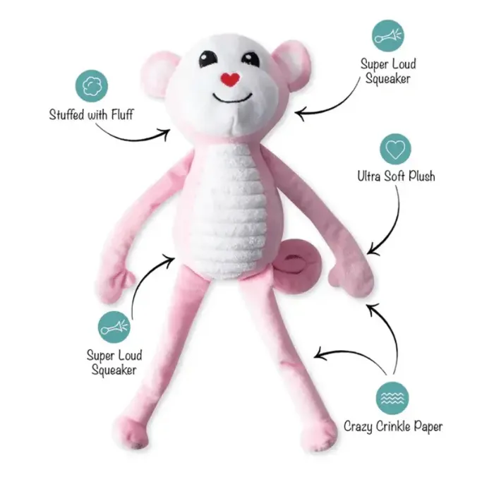 I'm bananas for you! Petshop by Fringe Studio “Monkey Love” is perfect for playtime, anytime. Made with a 2 super loud squeakers and crazy crinkle paper details, this toy was designed with interactive play in mind. Whether you squeak, crinkle or tug it, your pup will enjoy hangin' with you. Great for all sized dogs and not intended for aggressive chewers.