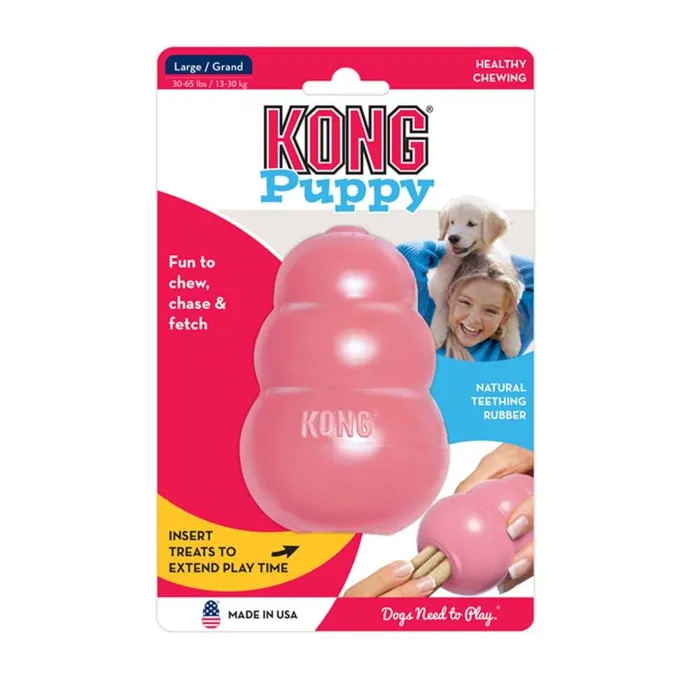 The Puppy KONG dog toy is customized for a growing puppy’s baby teeth, the unique, natural rubber formula is the most gentle within the KONG rubber toy line. Designed to meet the needs of a puppy’s 28-baby teeth, it helps teach appropriate chewing behavior while offering enrichment and satisfying a younger pup’s instinctual needs while the erratic bounce make it ideal for those pups that just want to play. A stuffed Puppy KONG occupies busy little ones while allowing pet parents the freedom to attend to their unique needs. Want to make crate training easier or extend play time? Be sure to stuff with puppy kibble and a dash of peanut butter. Add to the fun by including KONG Puppy Snacks and top with KONG Puppy Easy Treat.