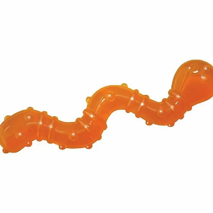 The OrkaKat Wiggle Worm by Petstages is a bright and bouncy cat chew toy made for cats that have an urge to chew. Made from durable food safe rubber with ridges that help massage your kitty's gums as they chew and bite. This little worm is ideal for little mouths and teething kittens but suitable for cats of all ages. Catnip-infused to keep your curious cat engaged and stimulated for multiple rounds of play!