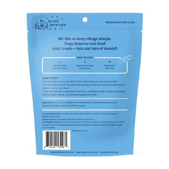 Ingredients: Oat Flour, Duck, Blueberries, Ground Rice, Ground Oats, Cane Molasses, Coconut Glycerin, Flaxseed, Citric Acid (Preservative)