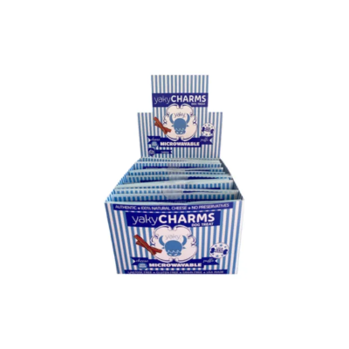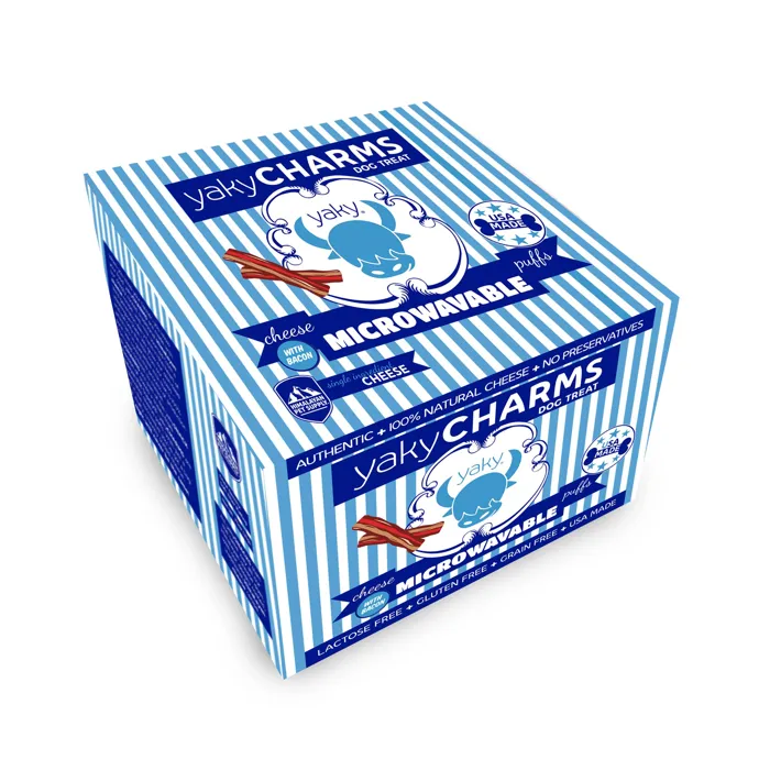 Enjoy movie night with your furry BFF! Yaky Charms are a delightful cheesy snack your dog will love. These bite sized treats are a light, fluffy, microwavable cheese puff which comes in a whimsical popcorn style bag. This limited ingredient snack now comes in delicious new flavors, bacon and peanut butter!