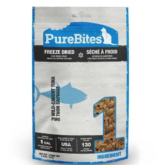 Go ahead, turn the bag around and look at the ingredients. PureBites® are made with only 1 ingredient: 100% Pure & Natural Ocean-Caught Yellowfin Tuna, Made in the USA. Cats love the taste of PureBites® because these treats are freeze dried RAW to lock in the aroma, texture and freshness they crave. Cat parents love PureBites® because these treats are 100% pure and rich in nutrients for a happy and healthy life.
