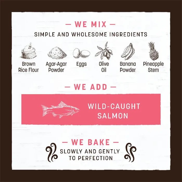 Ingredients - Salmon, Vegetable Gelatin, Brown Rice Flour, Organic Eggs, Olive Oil, Banana, Bromelain (Pineapple)