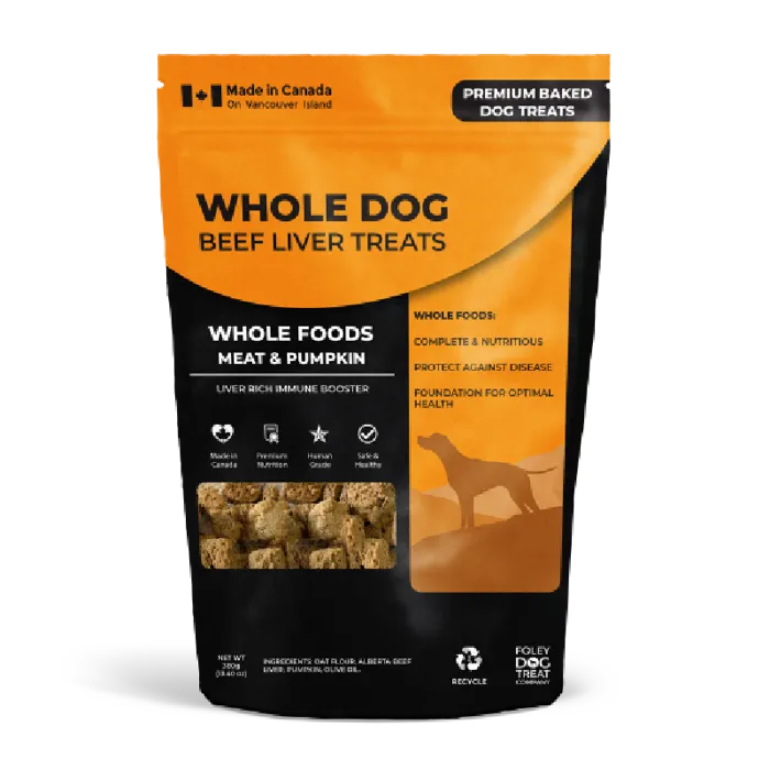 Canadian Brand. Whole Dog Beef Liver Snap Treats are made on Vancouver Island with Canadian sourced, all-natural, unprocessed, human grade ingredients. Proudly made with Alberta beef liver, these treats provide a rich immune boost with pumpkin which is high in amino acids and vitamins A & C to help fend off disease and parasites. Made with oat flour, they're gluten free, wheat free, and GMO free. Made with all-natural colours & flavours, they contain no preservatives. No processed ingredients mean happy tummies.